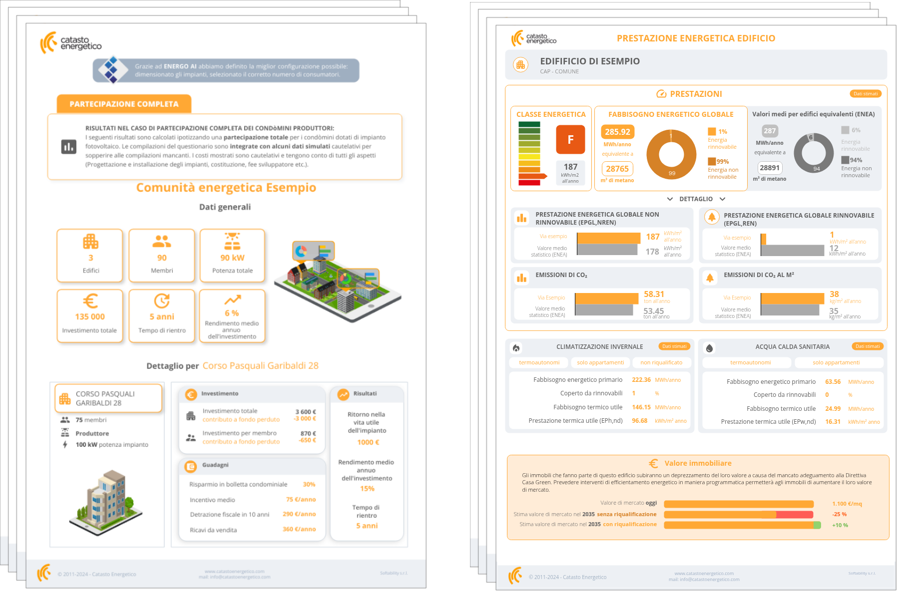 Catasto Energetico è un Energy Copilot sviluppato appositamente per chi deve vendere, non per chi deve progettare. L’interfaccia è intuitiva: si inserisce un indirizzo e l’algoritmo recupera tutti i dati dalle fonti ufficiali e effettua una diagnosi energetica del fabbricato. E’ possibile effettuare scenari di intervento come CER e AUC ed ottenere metriche di ROI pronte da mostrare all’amministratore di condominio.